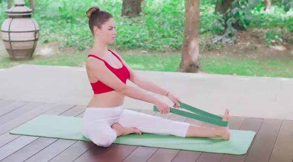 Согните правую ногу. Правой стопой упритесь в левое бедро. Возьмите в руки ремень и захватите им левую стопу. Тяните левую стопу на себя. Удерживайте напряжение. Туловище вытягивайте вверх. Спина прямая. Дыхание естественное. Затем, освободите левую ногу от ремня. Выпрямите правую. Сделайте то же самое в другую сторону.